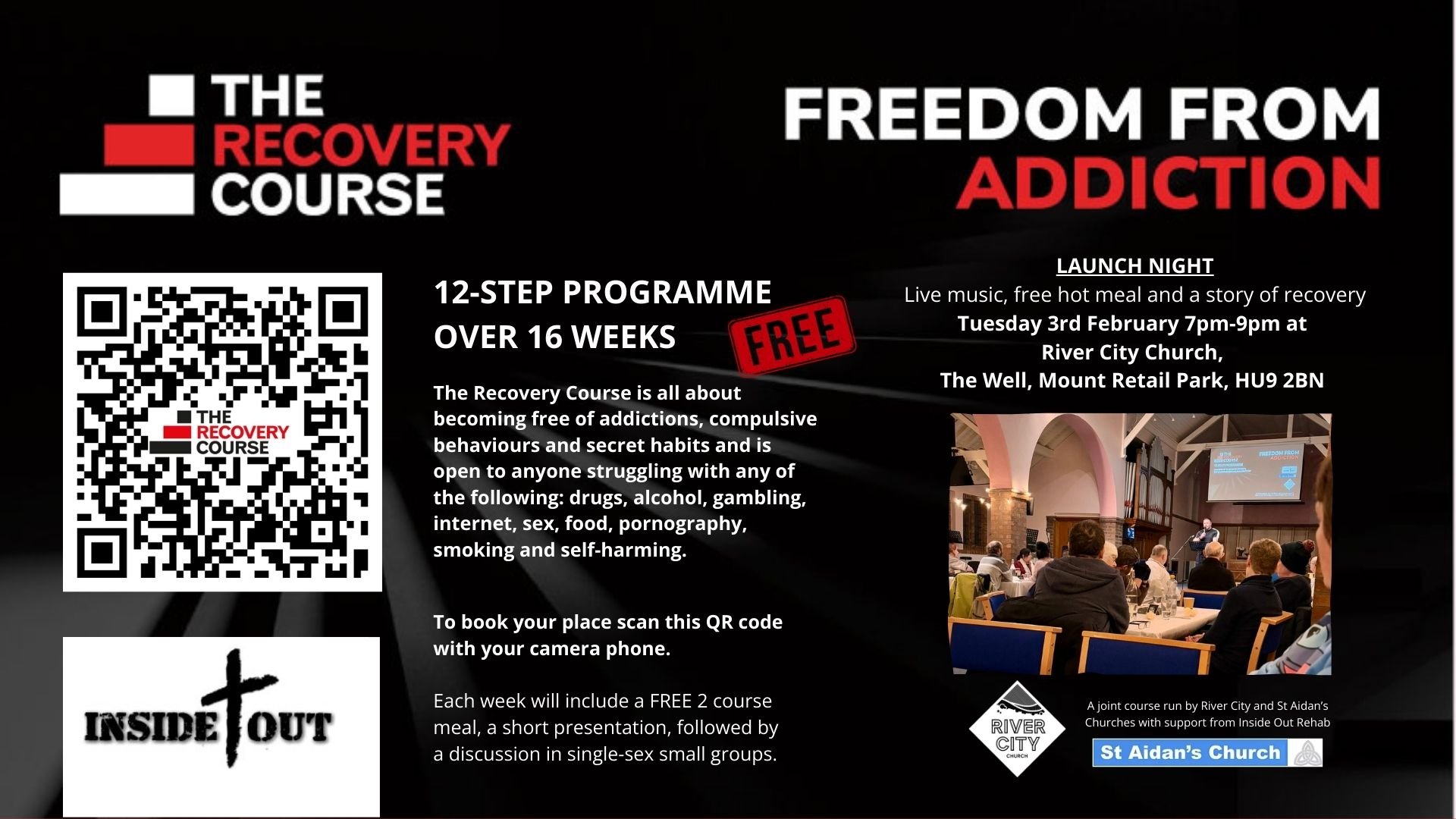 Looking for some support on your recovery journey? Come along to our launch night on Tues 3rd Feb 7pm with free hot meal, live music and story of recovery at The Well, Mount Pleasant, HU9 2BN, book your place here https://rivercityhull.churchsuite.com/events/5xeiysyp